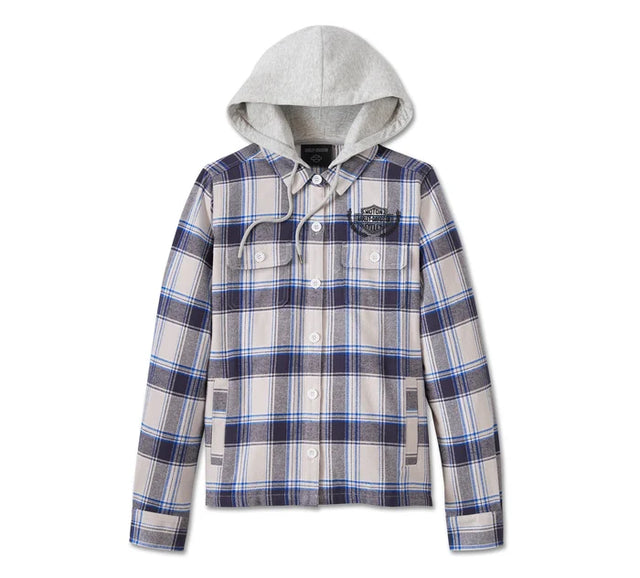 Bei der Harley Heritage Classic Hemdjacke erhält Karo ein vom Rennsport inspiriertes Upgrade. Diese Flanell-Hemdjacke mit Kapuze für Damen ist aus schwerem, gebürstetem Baumwoll-Twill gefertigt. Sie verfügt über Kapuze, die sich mit einem Reißverschluss abnehmen lässt, Handwärmertaschen mit Druckknopfverschluss und einen Kragen, der dank versteckter Druckknöpfe beim Fahren unter der Motorradbekleidung an seinem Platz bleibt. Das frische Karomuster passt gut zu den gestickten saisonalen Motiven, die unsere stolze Rennsportgeschichte ehren.