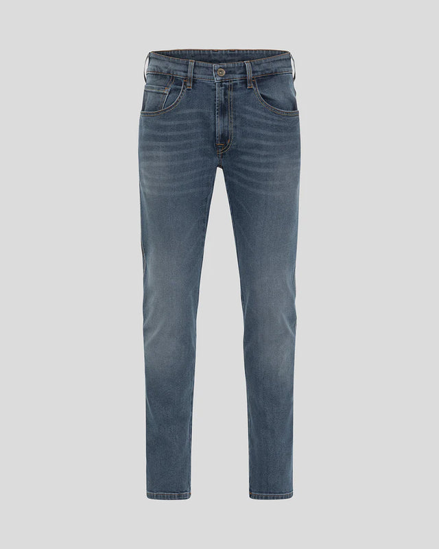 Edler washed Denim mit hochabriebfesten UHMWPE Fasern (61% Baumwolle, 19% Polyethylen, 11% Polyamid, 8% Elastomultiester, 1% Elasthan)