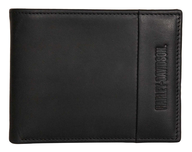 Dieser Geldbeutel für Herren von Harley-Davidson® besticht durch hochwertiges, schwarzes Echtleder mit besonders weicher und glatter Oberfläche. Die robuste Verarbeitung garantiert Langlebigkeit, während das ikonische, geprägte H-D®-Logo für authentischen Stil sorgt. Im Inneren befinden sich sechs Kartenfächer, zwei Ausweisfenster auf einem herausnehmbaren Passcase sowie ein Fach für Scheine. Der integrierte RFID-Schutz schützt Ihre Daten zuverlässig vor unbefugtem Auslesen. Maße: 11,4 cm x 8,9 cm (4,5" x 3,5"). Modellnummer: HDMWA11790-BLK.