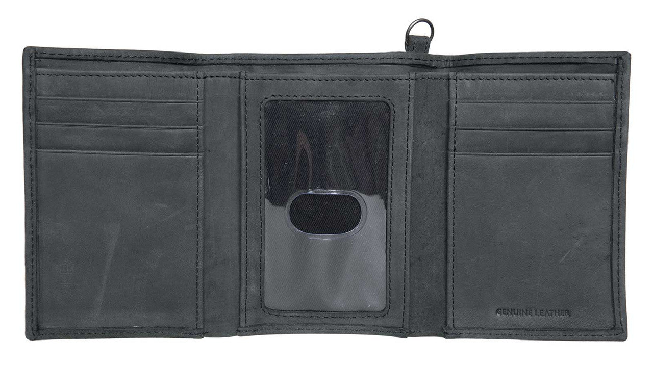 Das Harley-Davidson® Herren Tri-Fold Portemonnaie mit Rubber-Patch in Schwarz (Modell HDMWA11779-BLK) besteht aus hochwertigem, schwarzem Echtleder mit besonders weicher, glatter Oberfläche. Die langlebige Verarbeitung wird durch das ikonische Rubber Bar & Shield Logo abgerundet. Das Innenleben bietet sechs Kreditkartenfächer, ein ID-Fenster sowie zwei Geldscheinfächer. Die antike Nickel-Beschichtung sorgt für eine edle Optik. Dank RFID-Schutz sind Ihre persönlichen Daten vor elektronischem Diebstahl sicher. Mit den Maßen 11,5 x 8,3 cm ist das Portemonnaie kompakt und praktisch für den täglichen Gebrauch.